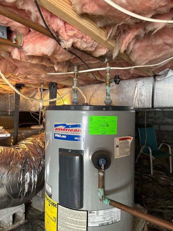 Conducted routine plumbing service agreement (PSA) inspection of water heater system. Observed American brand water heater with copper piping showing oxidation and greenish patina forming on some fittings. System appears functional but recommended monitoring pipe connections for potential future maintenance needs.