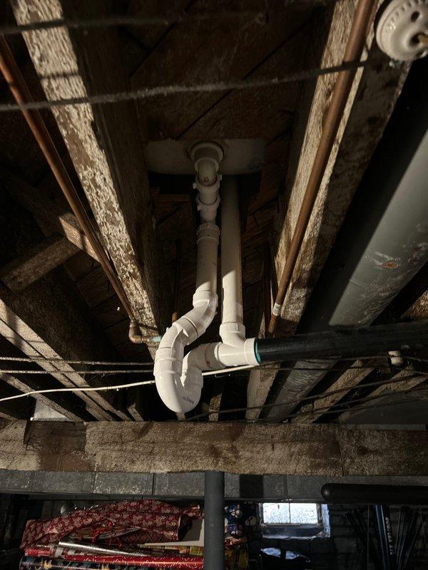 Completed removal of non-compliant shower drain system and installed new PVC piping with proper p-trap configuration to ensure code compliance. Work included cutting out existing drain line, installing new PVC components, and properly securing all connections to prevent leaks. System now provides proper drainage while meeting all current plumbing code requirements.
