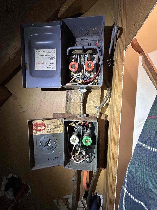Inspected electrical disconnect box serving water heater. Found two 18-amp and 30-amp fuse holders with brass bus bars and multiple wire connections. Observed accumulated debris and dust in bottom of enclosure. Tested electrical continuity and verified proper fuse sizing for water heater load requirements. Checked all wire connections at terminals for tightness and proper installation. Verified power supply to unit and tested heating elements for functionality. Restored hot water service to residence. Documented electrical panel condition with photographs for service records.