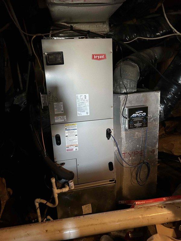 Responded to customer's non-urgent service call regarding difficulty installing air filter and thermostat battery replacement. Upon inspection of the Bryant HVAC system, assisted customer with proper filter installation technique and replaced batteries in the thermostat. System was tested to confirm proper operation of all components, including the connected APCO air purification system.