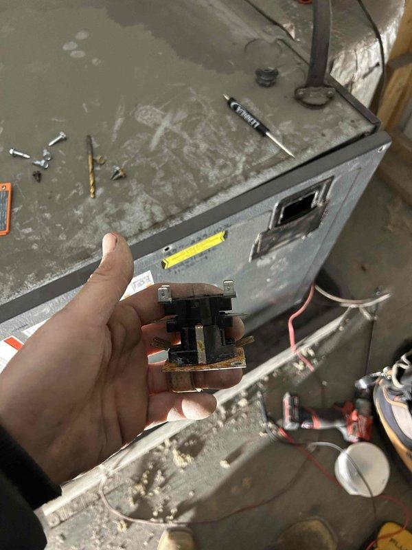 Responded to commercial no-heat call for electric furnace system not maintaining temperature (52°F indoor with 70°F setpoint). Inspection revealed faulty electrical relay/contactor with significant oxidation and corrosion. Removed and replaced damaged component to restore proper system operation.