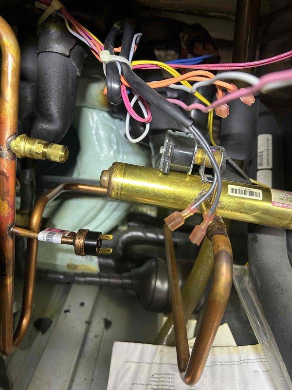 Returned to address ongoing issues with geothermal system experiencing low refrigerant pressures and operational instability. Upon arrival, confirmed system was cycling but not maintaining consistent operation. Pressure readings indicated refrigerant loss since previous service visit. Added refrigerant charge and cycled system between heating and cooling modes multiple times to stabilize pressures and restore normal operation. Pressures returned to acceptable range and system resumed proper function. Re-inspected previously identified leaking Cormax fitting, which remains seized and unable to be removed without risk of component damage. Fitting continues to show minor refrigerant seepage. Documented system configuration and component layout with photos for service records. Advised monitoring system performance and refrigerant levels, with recommendation to address seized fitting and potential TXV concerns if operational issues recur.